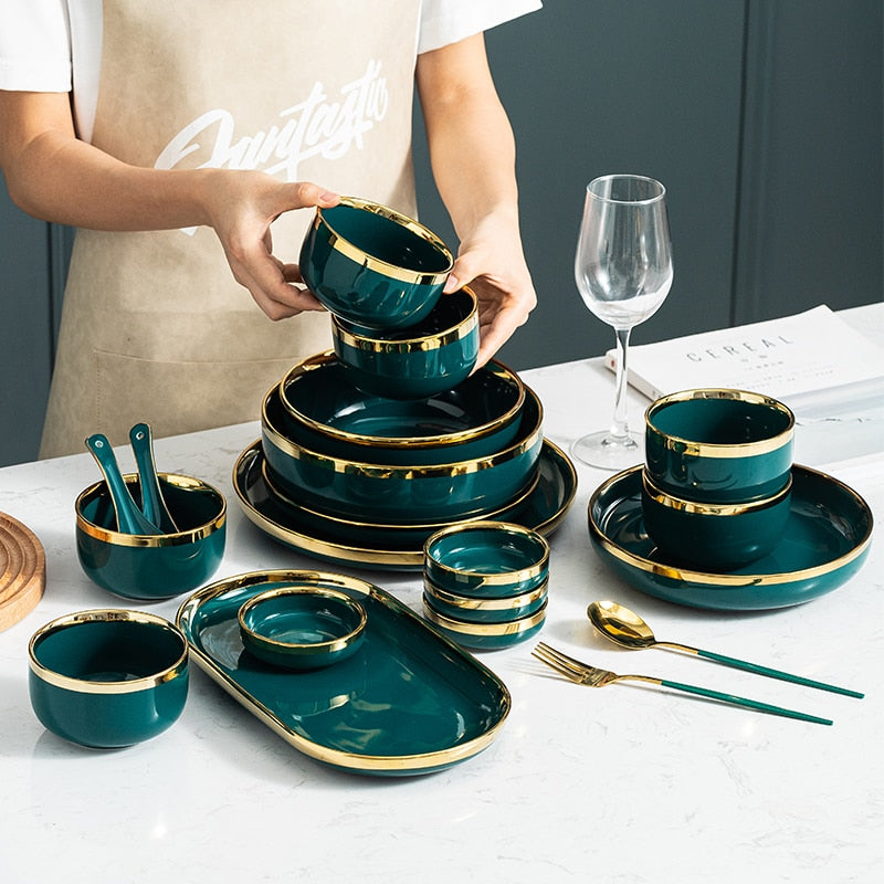 Ceramic Dinner Plates Dinnerware Set Dishes Luxury Green Food Dessert Plate Salad Soup Bowl Tableware Set for Restaurant Hotel