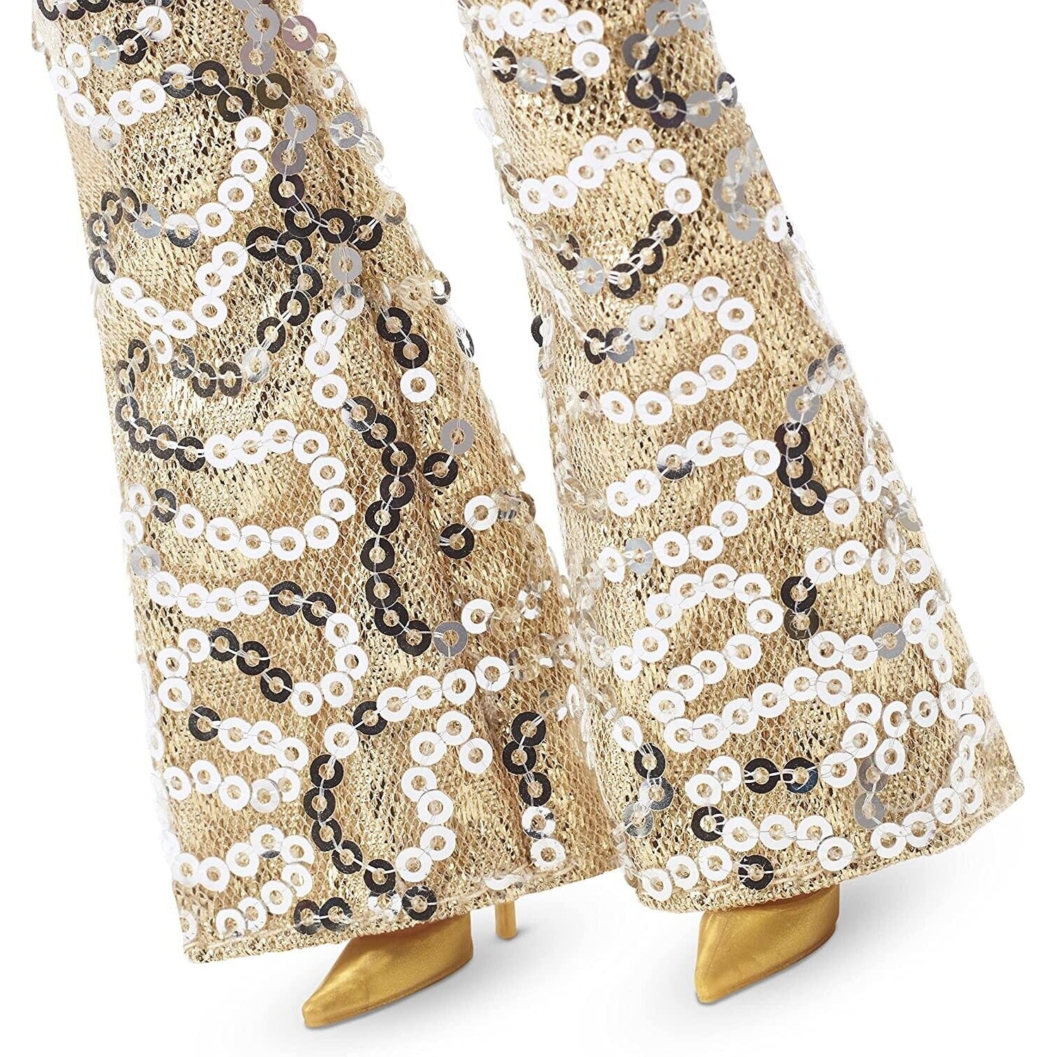 Strapless golden jumpsuit completely embellished with silvery sequins recreates a dance costume worn by Barbie in the film