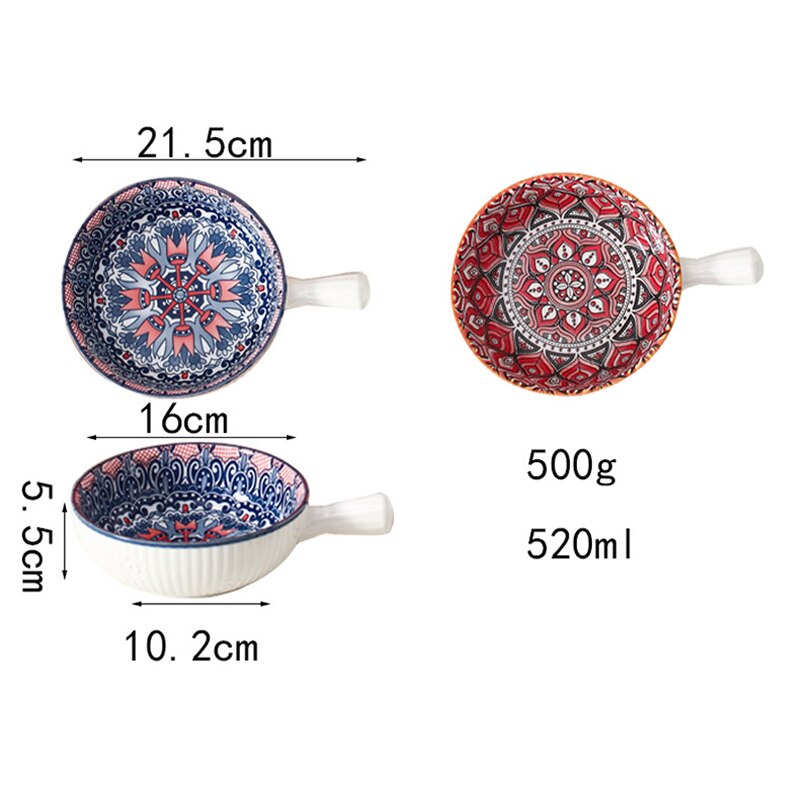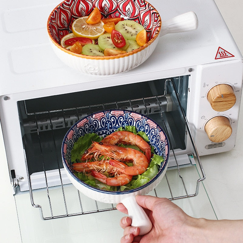 Bohemia Ceramic Salad Bowl With Handle Baking Bowl Cereal Fruit Bowl Solid Color Dessert Soup Noodle Bowl Microwave Oven